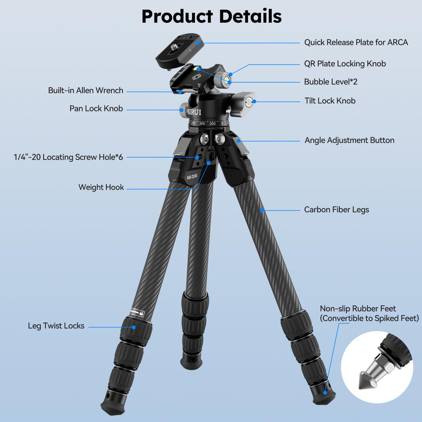 SIRUI 31.5" Compact Carbon Fiber Small Desktop Tripod with Low Profile Ball Head, Portable Lightweight Backpack Camera Tripod with Spikes for Travel Vlogging Tabletop, Macro Photography, AM-224S+G0