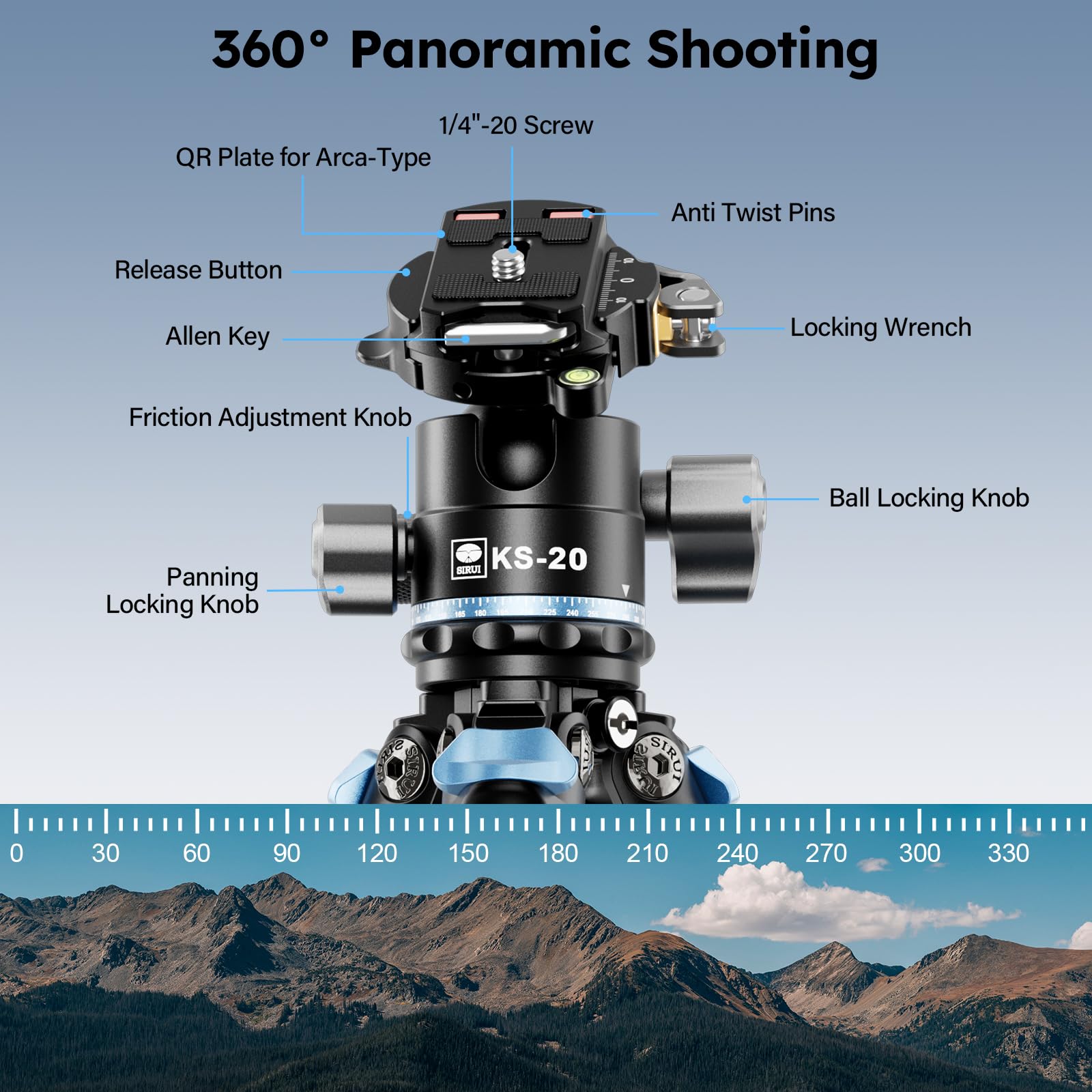 - Low Profile Ball Head:KS-20 ball head adopt 33mm ball, low gravity design provide better stability and higher load capacity. With damping knob control friction of the ball and smooth 360° panning base, you can adjust the shooting angel easily even if loading heavy camera equipment.