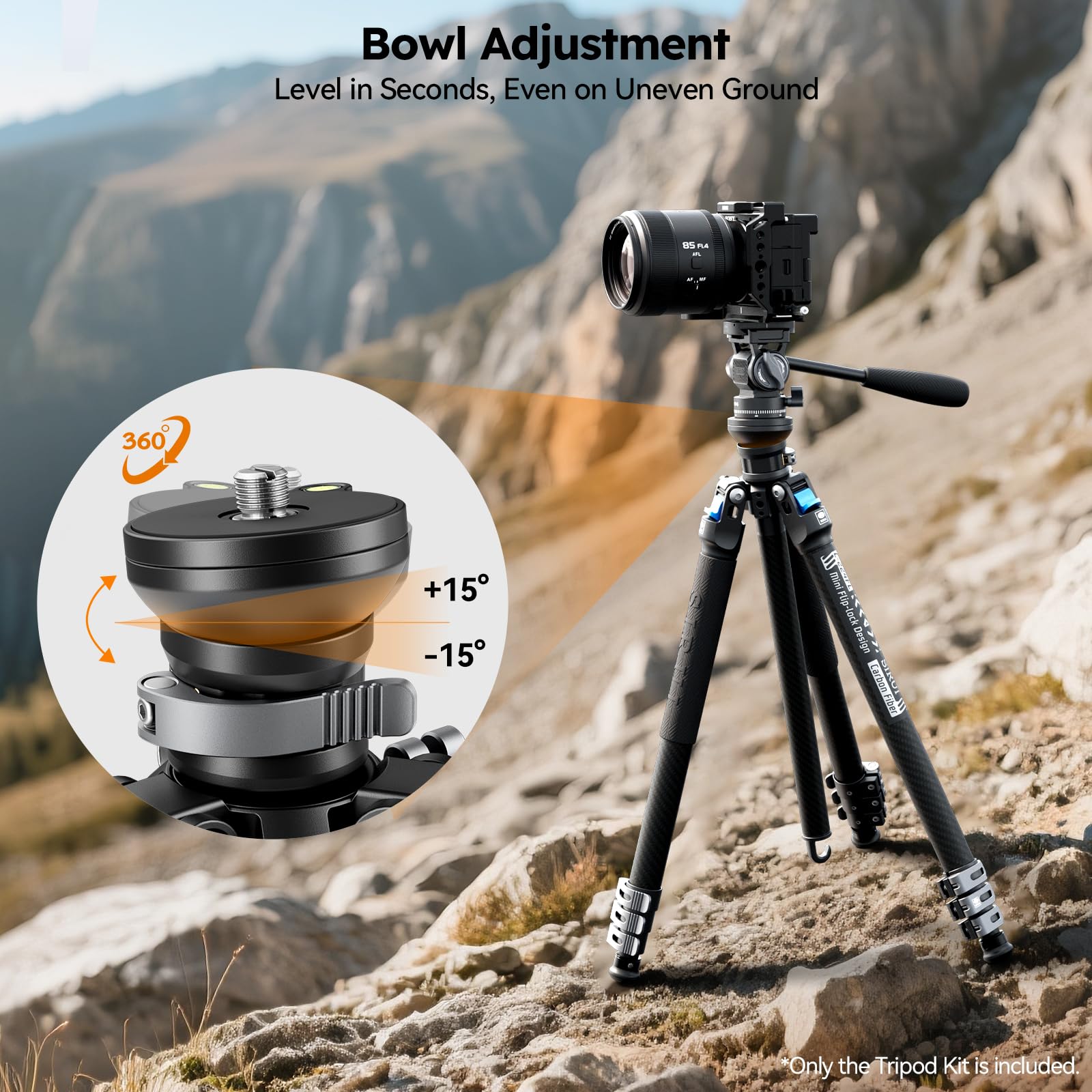 - Fast & Precise Leveling - The center column built-in a leveling bowl offering ±15° adjustment and 360° swivel with bubble level, making it easy to achieve accurate horizontal alignment for video shoots or panoramic photography without adjusting each leg. Interchangeable metal spikes help you to shooting stably in complex terrain, ideal for outdoor, hiking.