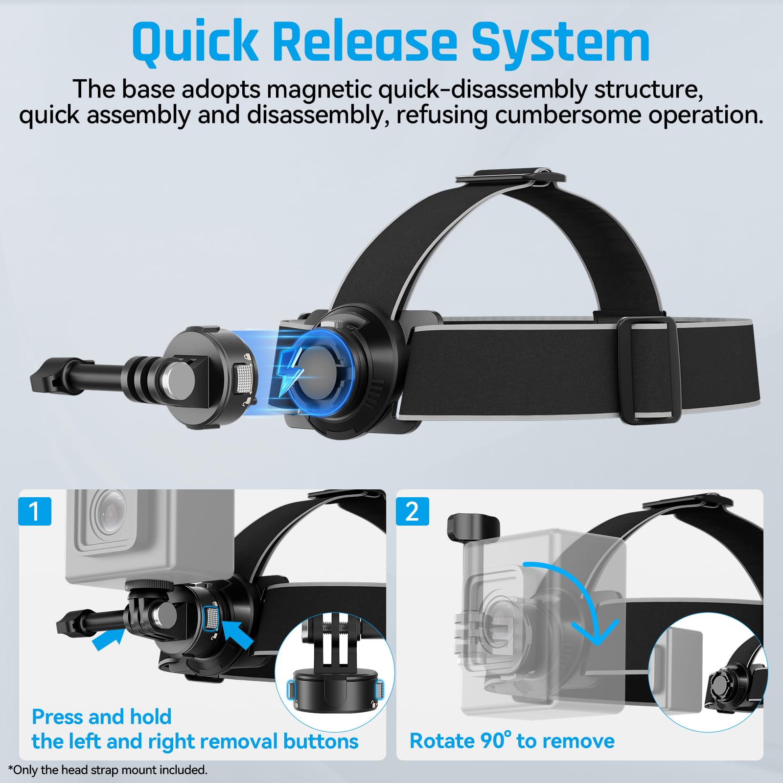 - Quick Release Action Camera Adapter: The camera adapter and base are equipped with a magnetic quick release function, which can be easily disassembled with a press and a turn; compared to ordinary sports camera head strap, this model is also equipped with one key to rotate 90°, which makes it easy to switch between horizontal and vertical shooting directly