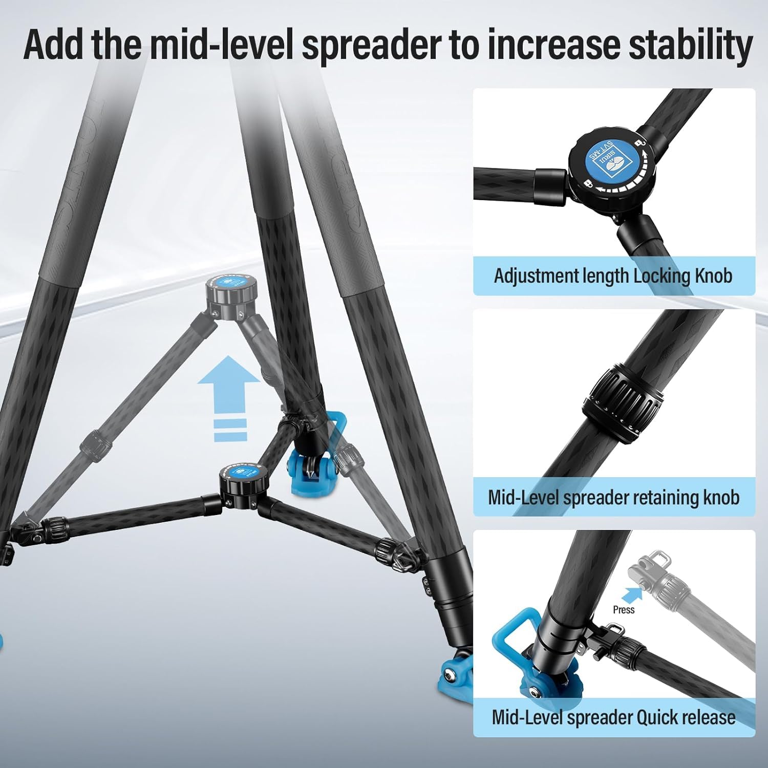 - [One-Step Height Adjustment with Ergonomic Flip Lock] 1.6-inch carbon fiber legs (supports 55.1lbs tripod / 33lbs head) with an ergonomic flip lock system. Unlock the trigger, telescope upward, and unfold in one step to adjust height from 12.99" to 66.53" in seconds. Non-slip rubber coating ensures a secure grip.