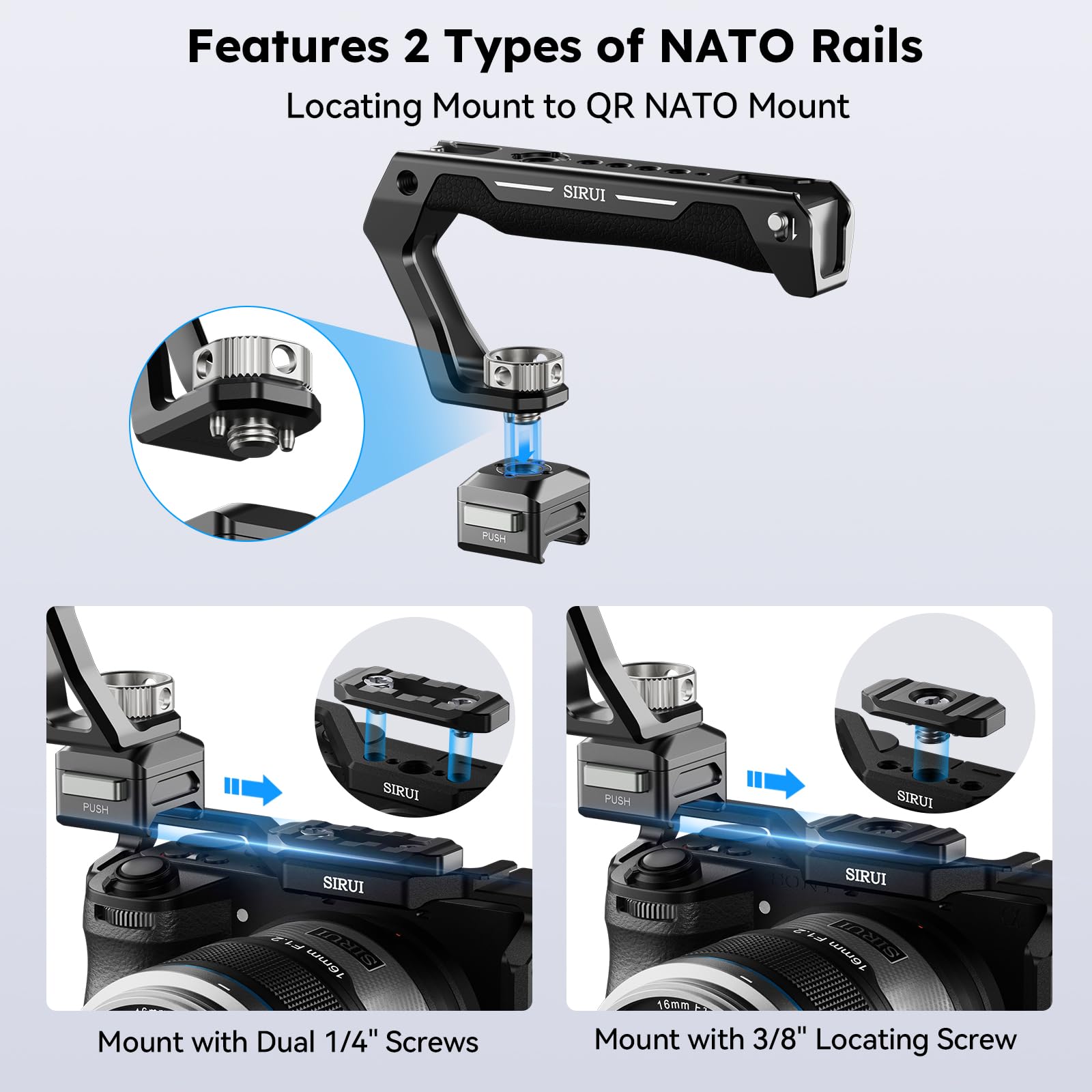 - Secure Locking Mechanism: The SIRUI AM-QN01 quick release plate kit features a base and two custom-designed NATO rails. With just a press of the button, the NATO rails can be easily unlocked, and they will automatically lock back in place once the button is released. Please note: While the NATO rails are compatible with other NATO clamp accessories, the QR plate's NATO clamp is not compatible with other NATO rails